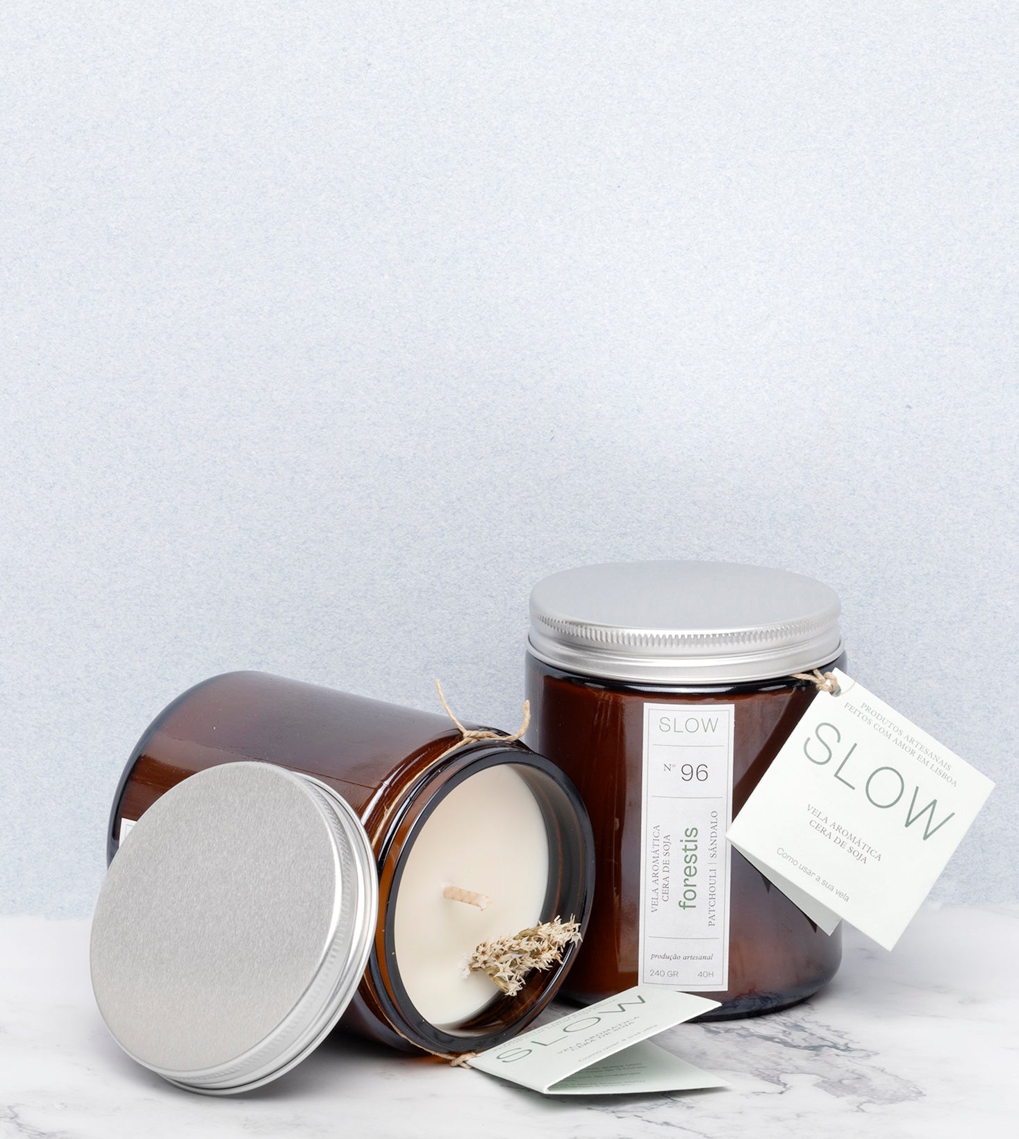 Vela artesanal e feita à mão, feita com cera de soja natural e certificada. O aroma é dado por óleos perfumados limpos, também certificados pela IFRA. As nossas misturas de velas são todas feitas de acordo com o mais recente regulamento europeu, e estão todas registadas na entidade nacional de emergência, o CIAV - Centro de Informação Anti-venenos.